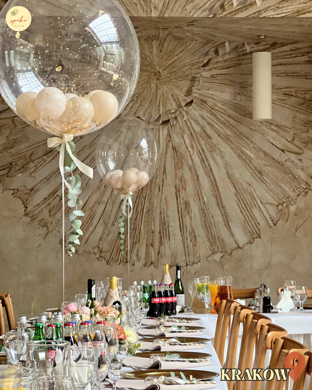 Szukasz eleganckiej i nowoczesnej dekoracji balonowej do wyjątkowej przestrzeni? Transparentne balony typu bubble z delikatnym płatkami złota to doskonały wybór na kolacje, przyjęcia okolicznościowe, eventy firmowe czy kameralne uroczystości. Subtelna forma i stonowana kolorystyka pięknie dopełniają aranżację stołu, nie przytłaczając wnętrza.