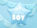 Balon foliowy pastelowy Gwiazdka w kolorze jasnoniebieskim z białym napisem It's a boy wraz z napełnieniem helem,