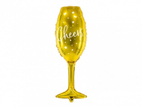 Balon foliowy metalizowany Kieliszek w kolorze złotym z białym napisem "Cheers" wraz z napełnieniem helem,