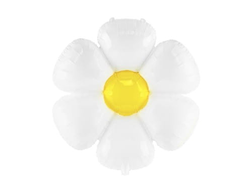 Błyszczący balon foliowy Stokrotka w kolorze białym z żółtym nadrukiem wraz z napełnieniem helem,