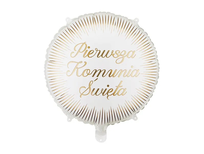 Balon foliowy pastylka Pierwsza Komunia Święta wraz z napełnieniem helem będzie elegancką dekoracją na uroczystość komunijną. Biały kolor ze złotymi promieniami tworzy subtelną i uroczystą kompozycję, idealną na ten wyjątkowy dzień.