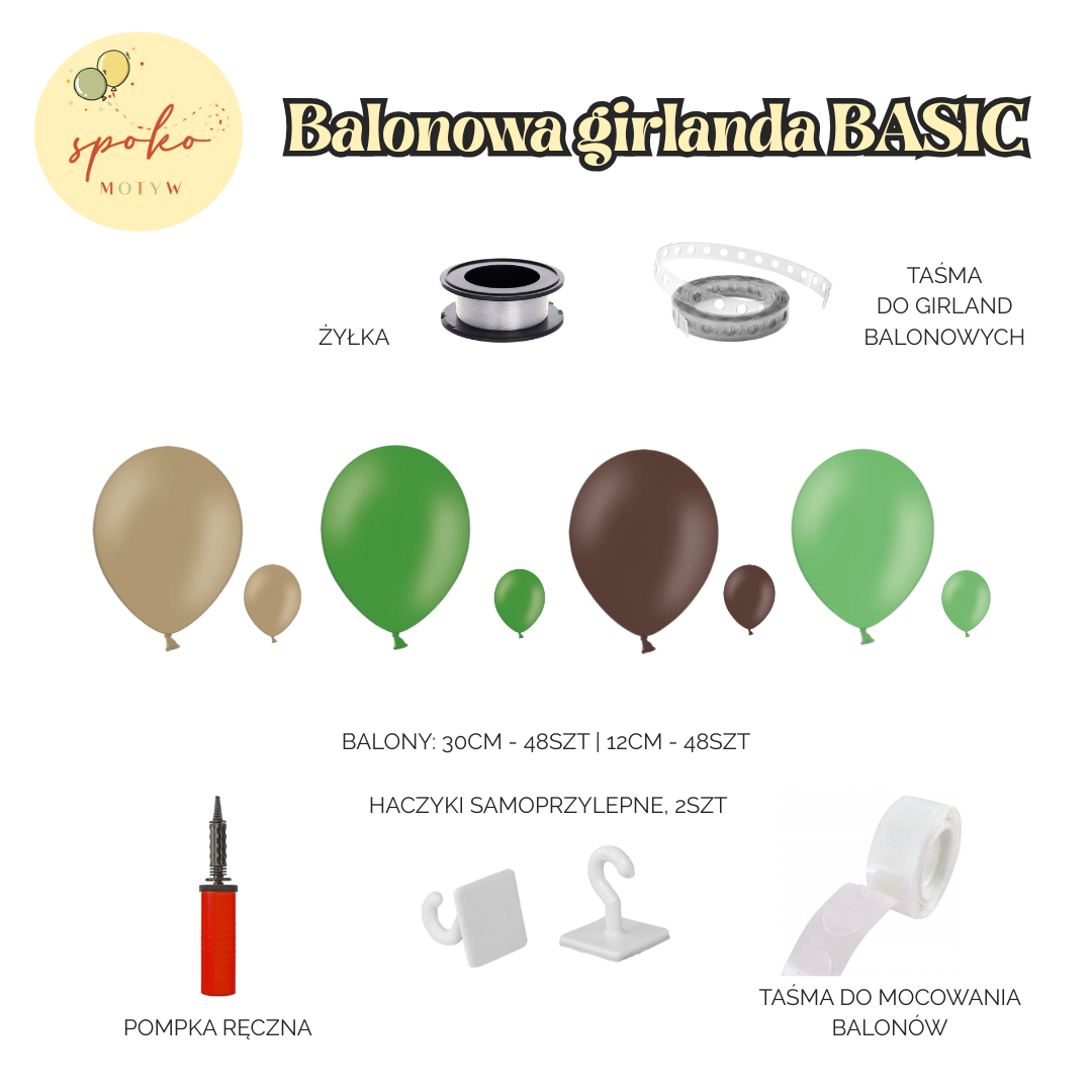 - 48 balonów, 12cm w czterech kolorach: zielony, j. brązowy, c. zielony, brązowy - do wizualnego wykończenia girlandy,