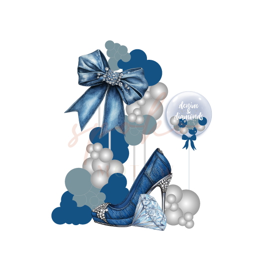 - balon bubble wypełniony mini balonikami i płatkami srebra, z naklejką "Denim & Diamonds", napełniony helem