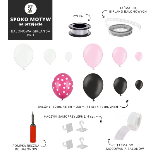 - 48 balonów, 30cm w czterech kolorach: różowym w białe kropki, białym, jasnoróżowym i czarnym - do stworzenia podstawy girlandy,