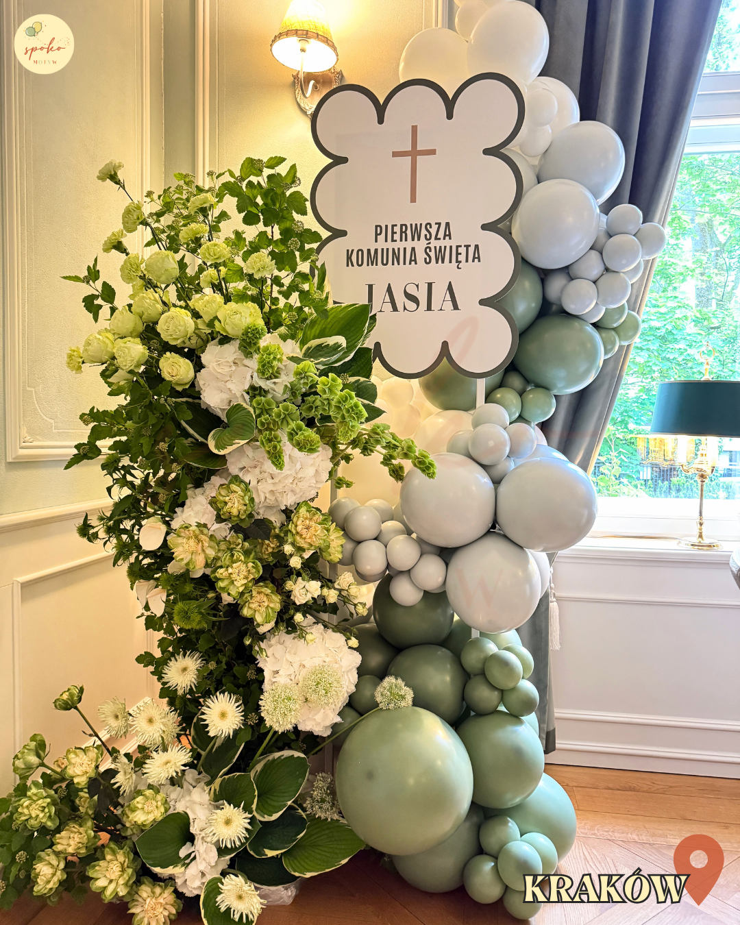 Dekoracja balonowa, ścianka z dekoracją KWIATOWĄ PRO na KOMUNIE ŚWIĘTĄ (dostawa, montaż Kraków)