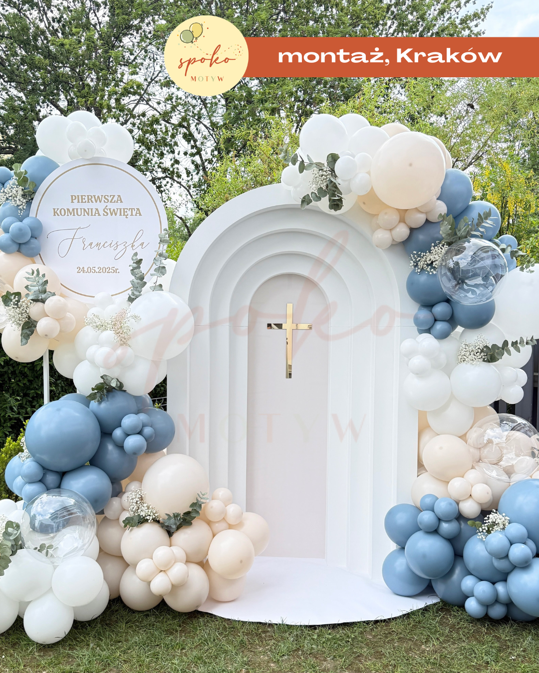 Dekoracja balonowa, ścianka na KOMUNIE ŚWIĘTĄ DUSTY BLUE (dostawa, montaż Kraków)