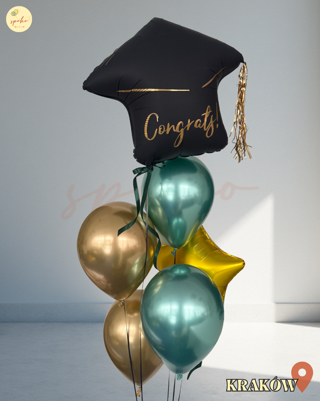 Elegancki balonowy bukiet z czapką absolwenta to idealna dekoracja i prezent z okazji ważnego osiągnięcia. Klasyczne połączenie czerni, złota i butelkowej zieleni nadaje całości nowoczesnyi elegancki charakter. Bukiet doskonale sprawdzi się jako niespodzianka dla absolwenta oraz na pamiątkowych zdjęciach.