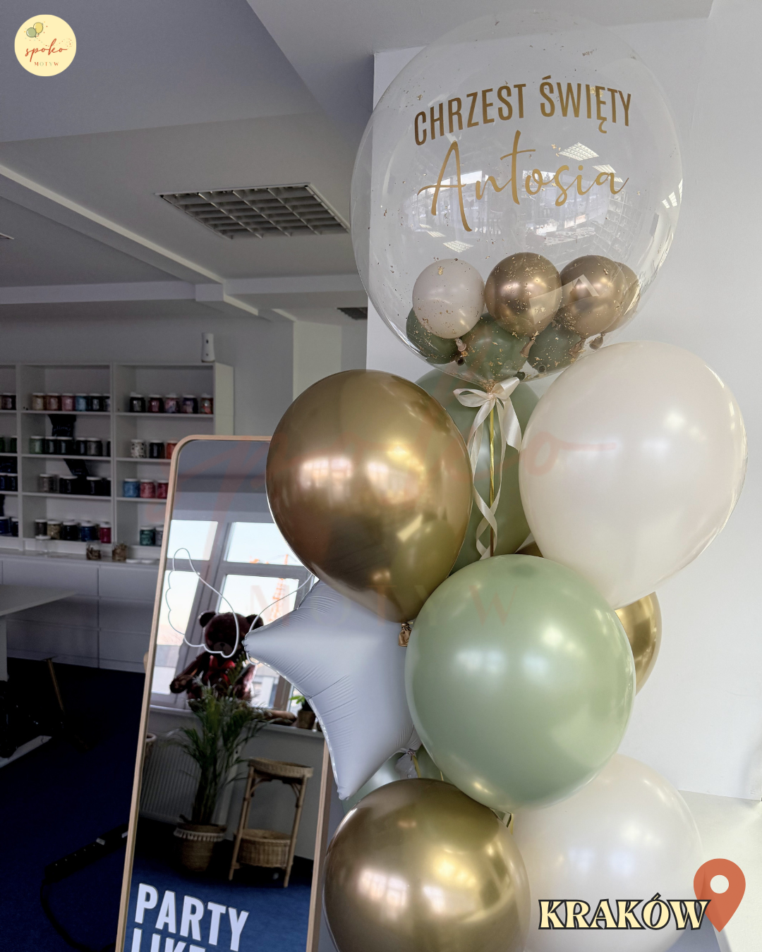 • balony lateksowe w odcieniach złota, bieli i pistacji