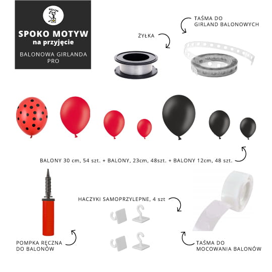 - 54 balony, 30cm w trzech kolorach: czerwonym w czarne kropki (18x), czerwonym (18x) i czarnym (18x) - do stworzenia podstawy girlandy,