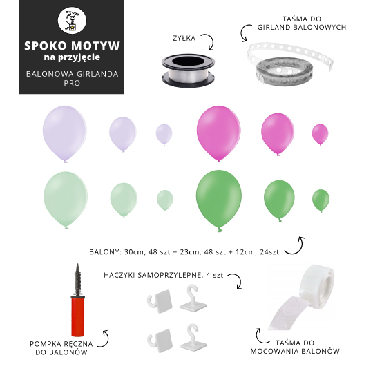 - 48 balonów, 12cm w czterech kolorach: jasnofioletowym, fuksji, pistacjowym i zielonym - do wizualnego wykończenia girlandy,