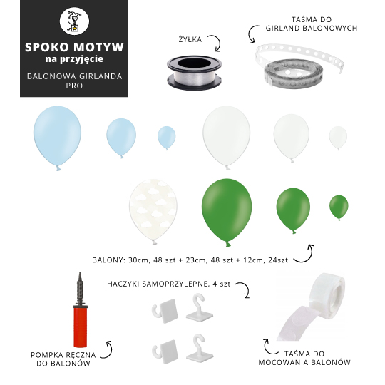 - 48 balonów, 30cm w czterech kolorach: transparentnym w chmurki, jasnoniebieskim, białym i ciemnozielonym - do stworzenia podstawy girlandy,