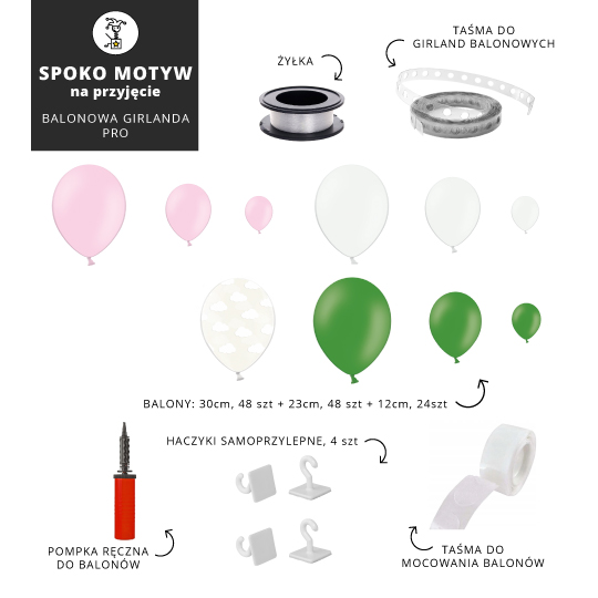 - 48 balonów, 30cm w czterech kolorach: transparentnym w chmurki, jasnoróżowym, białym i ciemnozielonym - do stworzenia podstawy girlandy,
