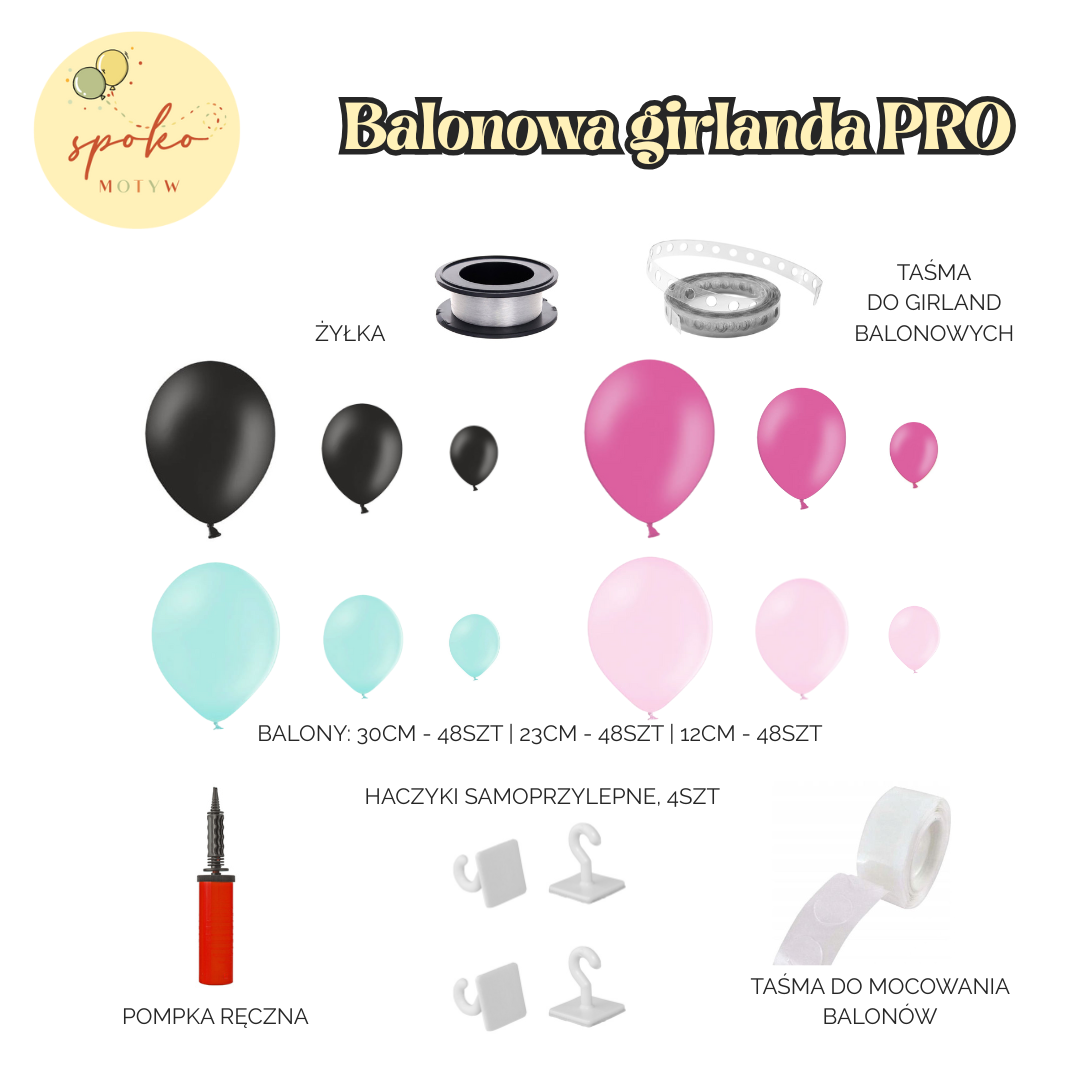 - 48 balonów, 12cm w czterech kolorach: czarny, c. różowy, blady różowy, j. miętowy - do wizualnego wykończenia girlandy,