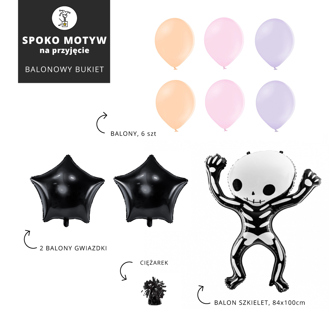 Bukiet z balonów to wyjątkowo wdzięczna dekoracja przyjęcia. Na czas imprezy ustawisz go w dowolnym miejscu. Będzie także pięknym dodatkiem do pamiątkowych zdjęć! Zestaw, który widzisz na zdjęciu będzie pasował idealnie na HALLOWEEN. Gwarantujemy, że uroczy szkielet wywoła radość uczestników przyjęcia.