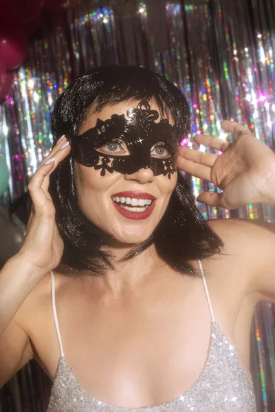 Maska karnawałowa w kolorze czarnym o wymiarach ok. 17 x 9 cm. Wiązana na wstążkę.