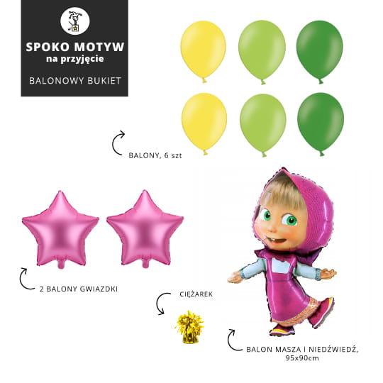 Bukiet z balonów to wyjątkowo wdzięczna dekoracja przyjęcia. Na czas imprezy ustawisz go w dowolnym miejscu. Będzie także pięknym dodatkiem do pamiątkowych zdjęć! Zestaw balonów z balonem w kształcie Maszy idealnie wpasuje się w urodziny z motywem z bajki Masza i Niedźwiedź.