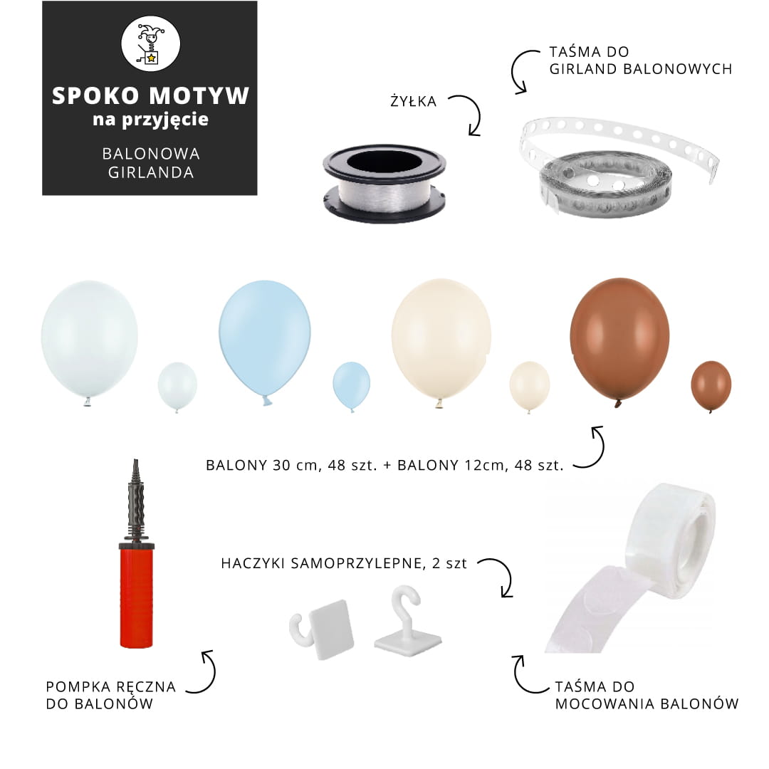 - 48 balonów o średnicy 30 cm w czterech kolorach: mglisty niebieski, jasny niebieski, jasny cielisty i kawowy – do stworzenia solidnej podstawy girlandy;