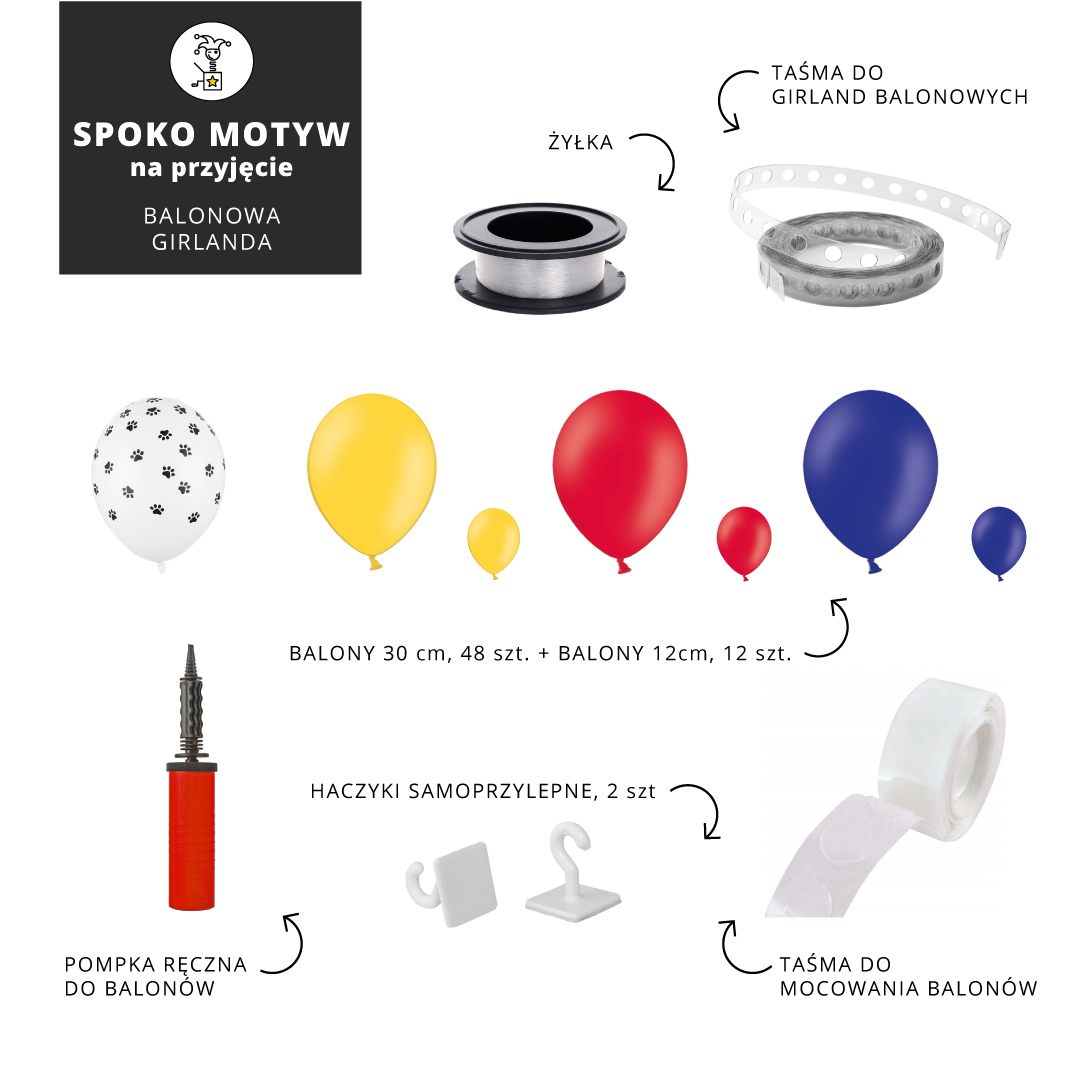 - 48 balonów, 30cm w czterech kolorach: białym w czarne łapki, żółtym, czerwonym, ciemnoniebieskim - do stworzenia podstawy girlandy,