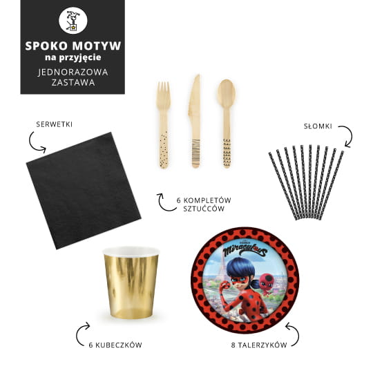 Jednorazowa zastawa to komplet produktów idealnie uzupełniających przyjęcie z motywem przewodnim MIRACULOUS: Biedronka i Czarny Kot.