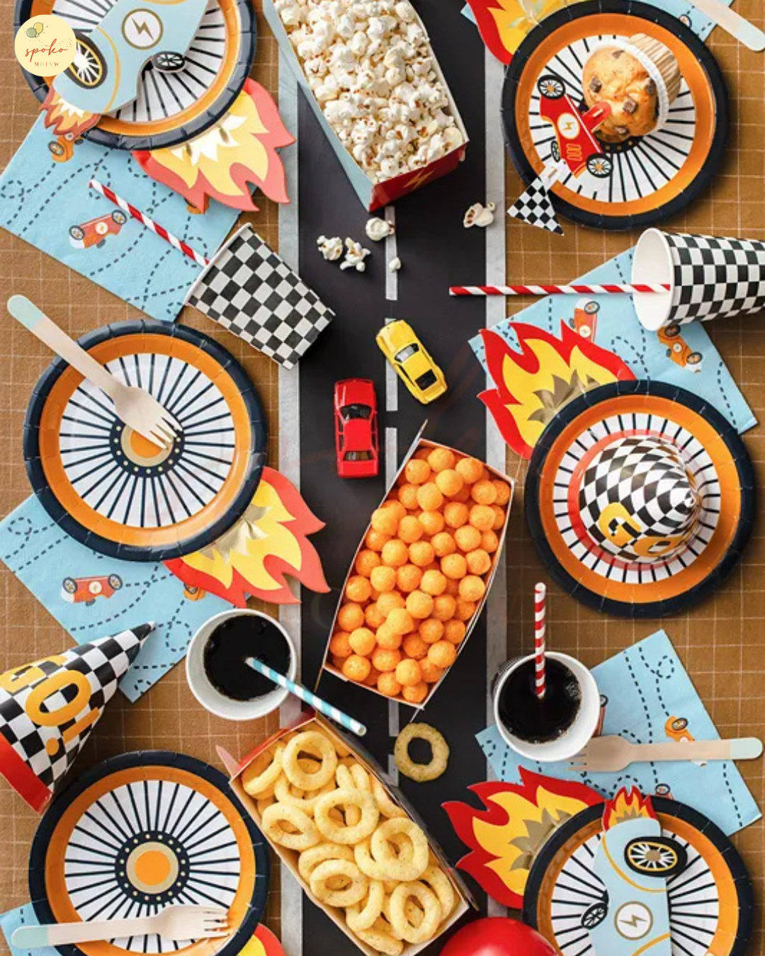 Zestaw dekoracji na stół inspirowany załączonym zdjęciem sprawdzi się świetnie w przygotowaniach do urodzin z motywem autek.