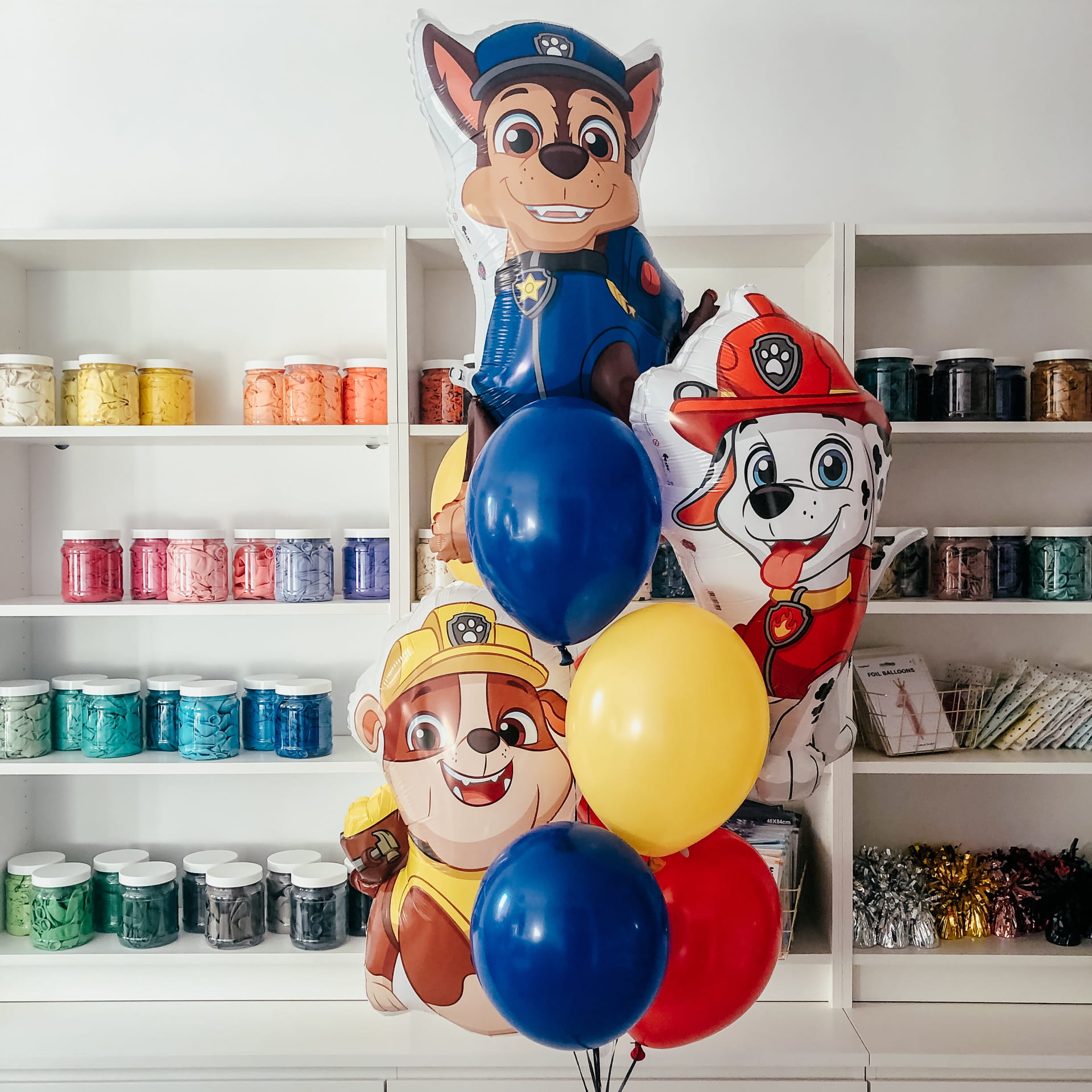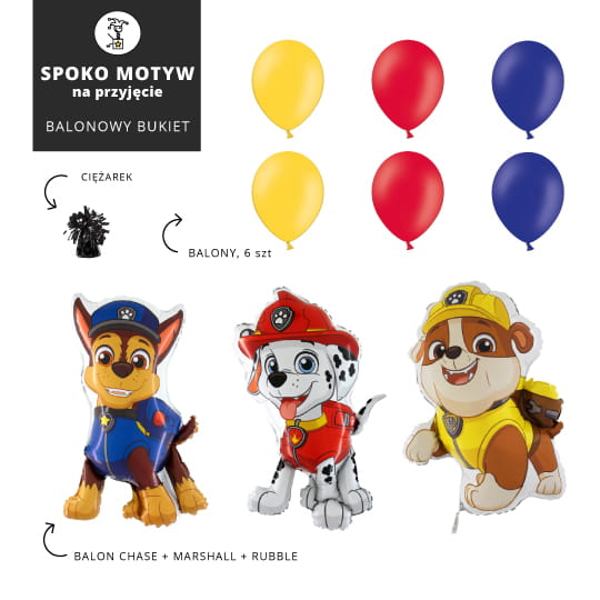 Balonowy bukiet z ulubieńcami dzieci z bajki Psi Patrol - pieskami Chase'm, Marshalle'm i Rubble'm to dodatek, który zrobi duże wrażenie na solenizancie i jego gościach.