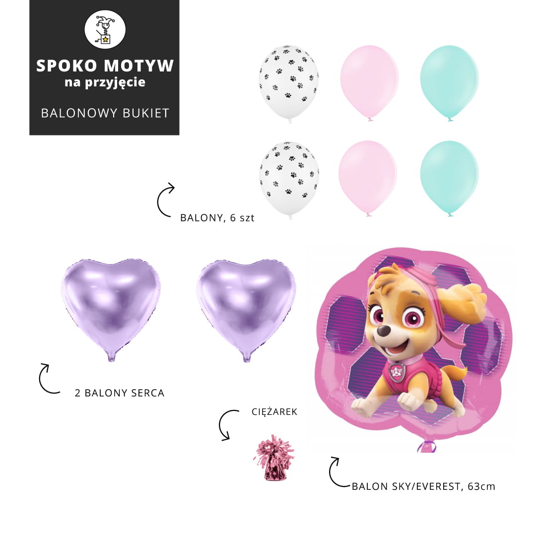 Balonowy bukiet z pieskiem Skye to dodatek, który zrobi duże wrażenie na solenizancie i jego gościach.