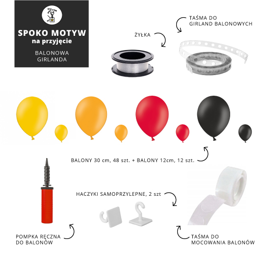 - 24 balony, 12cm w czterech kolorach: żółtym, pomarańczowym, czerwonym i czarnym - do wizualnego wykończenia girlandy,