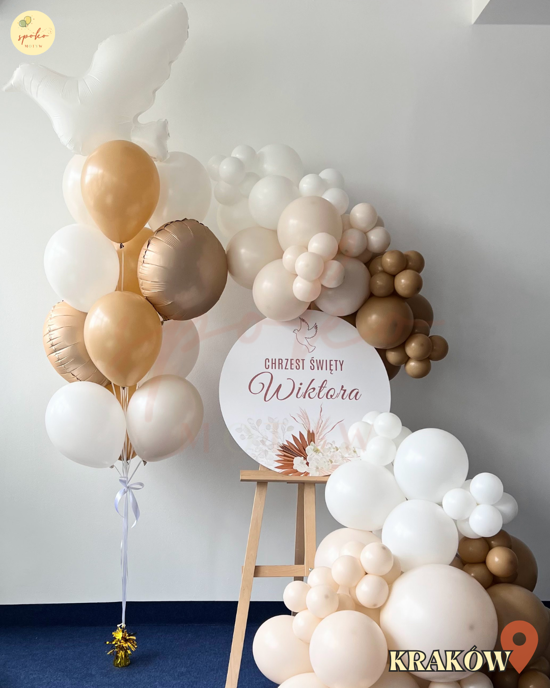 Personalizowana tabliczka oraz elegancka kompozycja balonowa sprawiają, że dekoracja doskonale podkreśla podniosły charakter uroczystości i tworzy piękne tło dla rodzinnych zdjęć z tego wyjątkowego dnia.