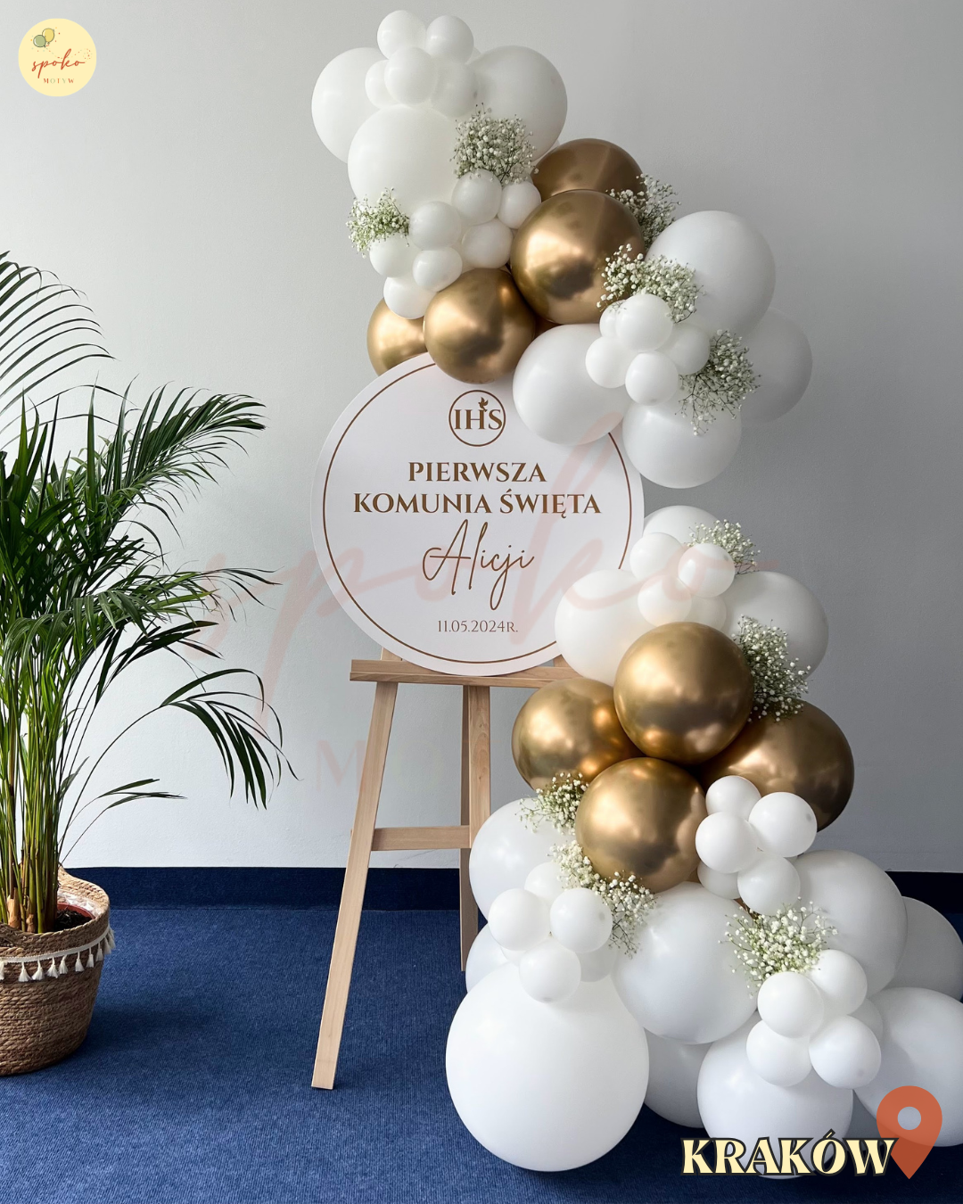 Personalizowana tabliczka oraz elegancka kompozycja balonowa sprawiają, że dekoracja doskonale podkreśla podniosły charakter uroczystości i tworzy piękne tło dla rodzinnych zdjęć z tego wyjątkowego dnia.