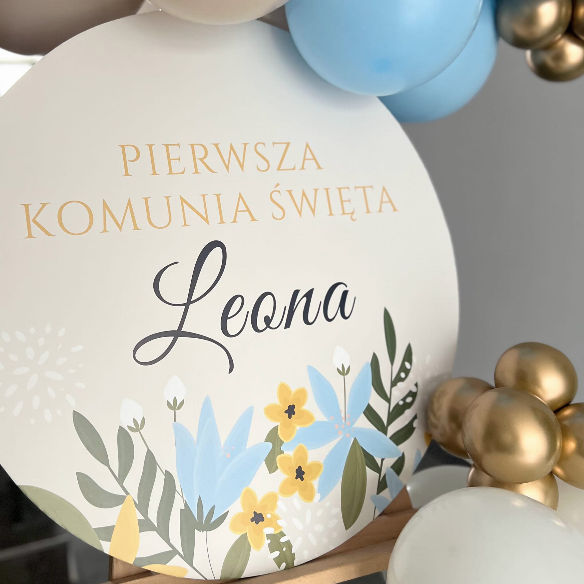 - personalizowaną, okrągłą tabliczkę z imieniem dziecka, okazją oraz datą uroczystości,
