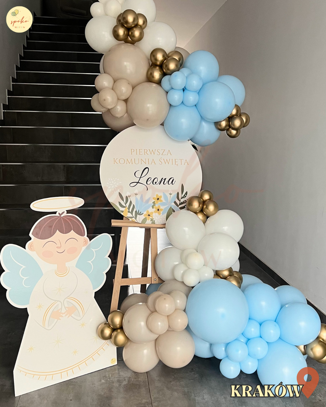 Personalizowana tabliczka oraz elegancka kompozycja balonowa sprawiają, że dekoracja doskonale podkreśla podniosły charakter uroczystości i tworzy piękne tło dla rodzinnych zdjęć z tego wyjątkowego dnia.