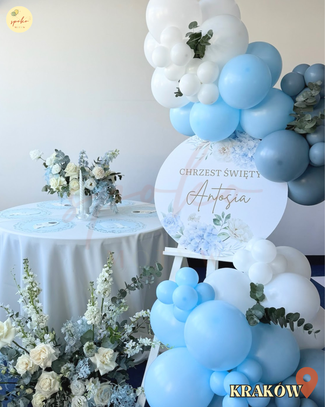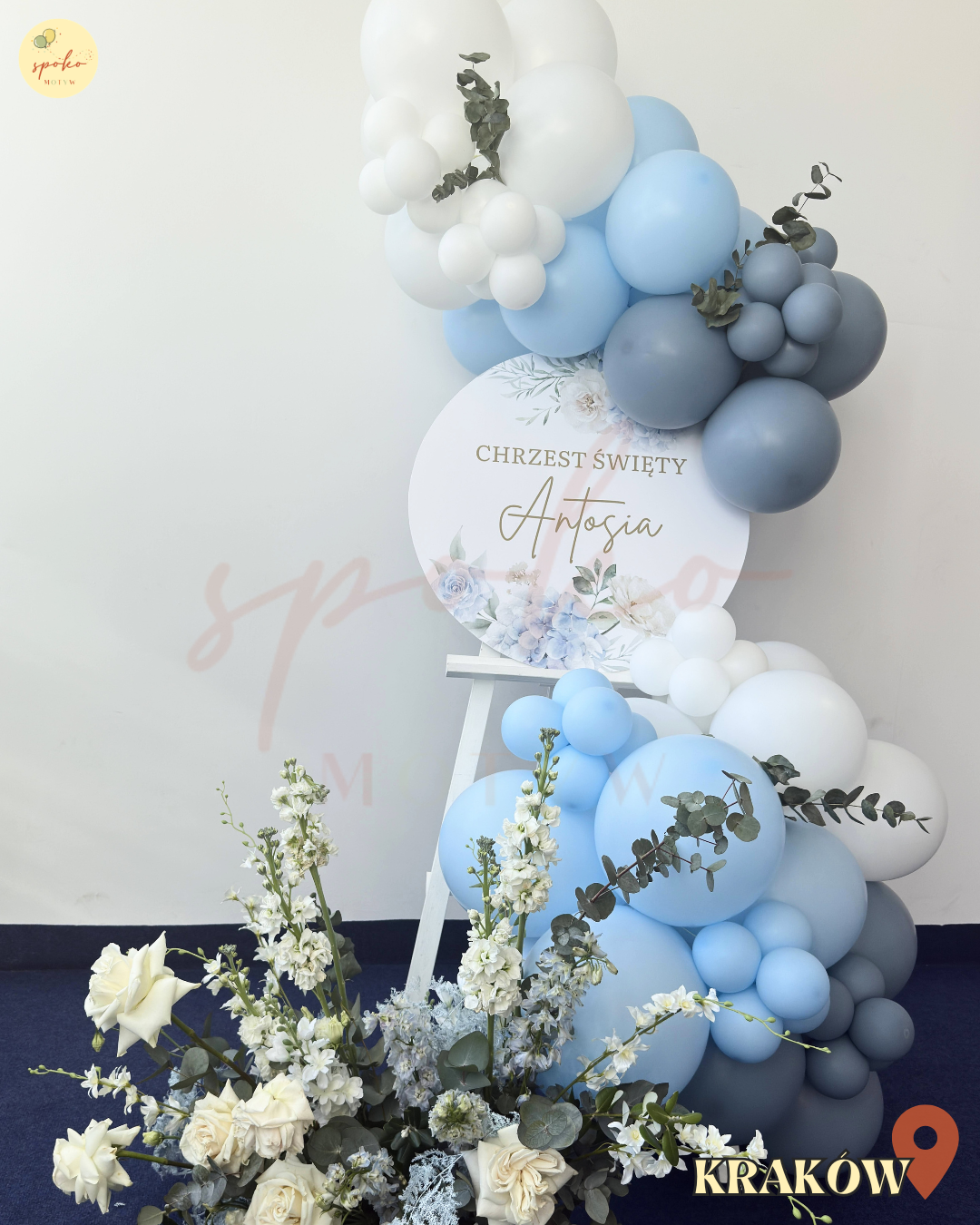 Szukasz szybkiej w rozstawieniu dekoracji na Chrzest Święty lub Pierwszą Komunię Świętą? Nasz personalizowany zestaw dekoracji to elegancka i efektowna forma dekoracji przyjęcia. Balonowa girlanda oparta o sztalugę z personalizowaną tabliczką tworzy piękne tło do zdjęć i przyciąga uwagę gości już od pierwszych chwil uroczystości.