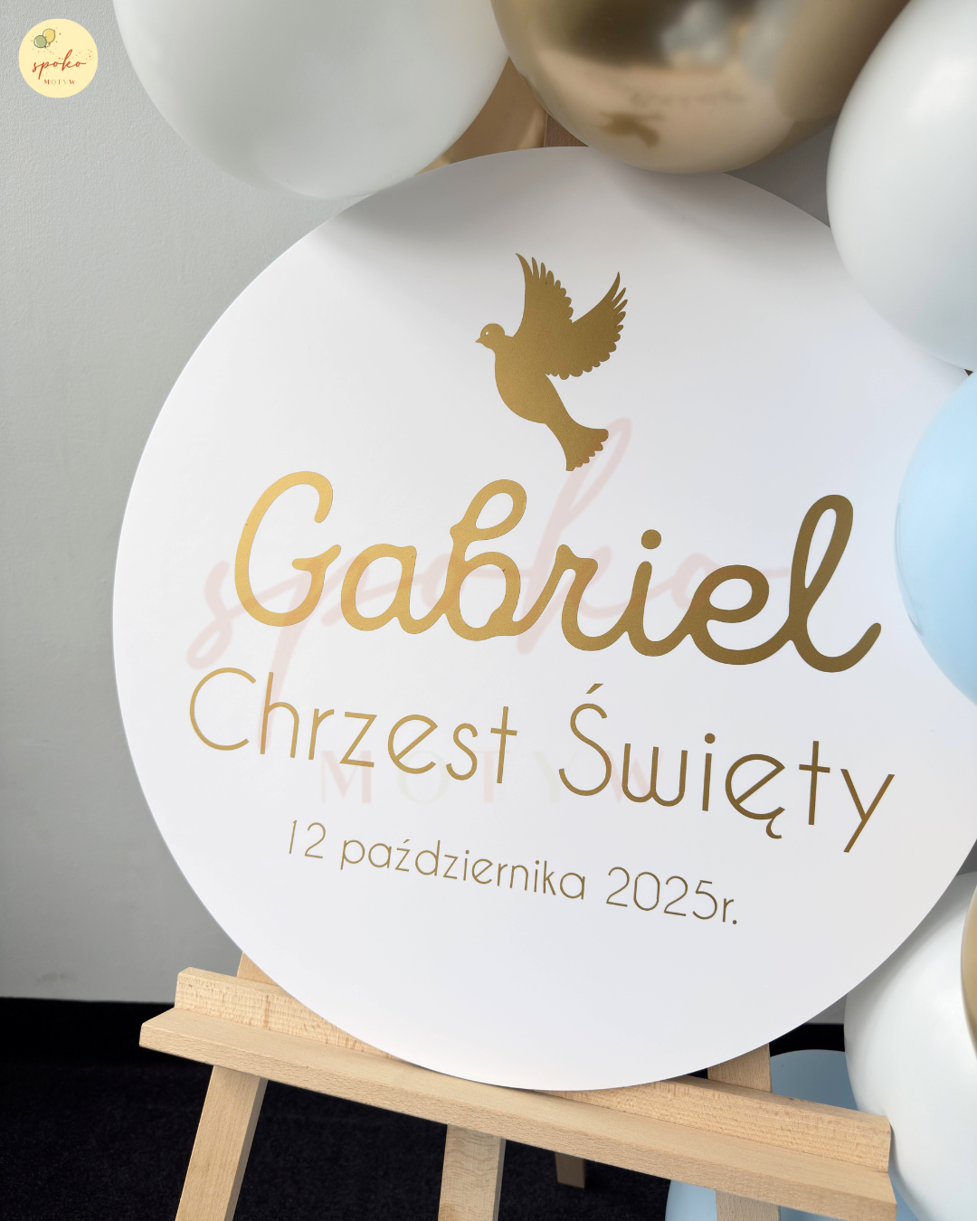 Personalizowana tabliczka oraz elegancka kompozycja balonowa sprawiają, że dekoracja doskonale podkreśla podniosły charakter uroczystości i tworzy piękne tło dla rodzinnych zdjęć z tego wyjątkowego dnia.