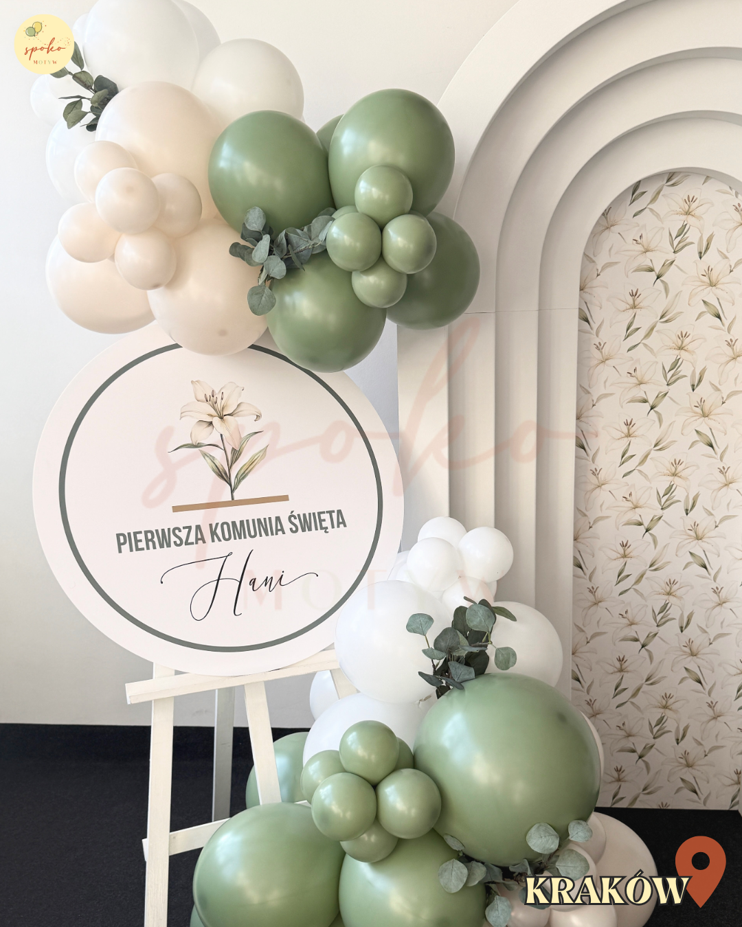 Personalizowana tabliczka oraz elegancka kompozycja balonowa sprawiają, że dekoracja doskonale podkreśla podniosły charakter uroczystości i tworzy piękne tło dla rodzinnych zdjęć z tego wyjątkowego dnia.