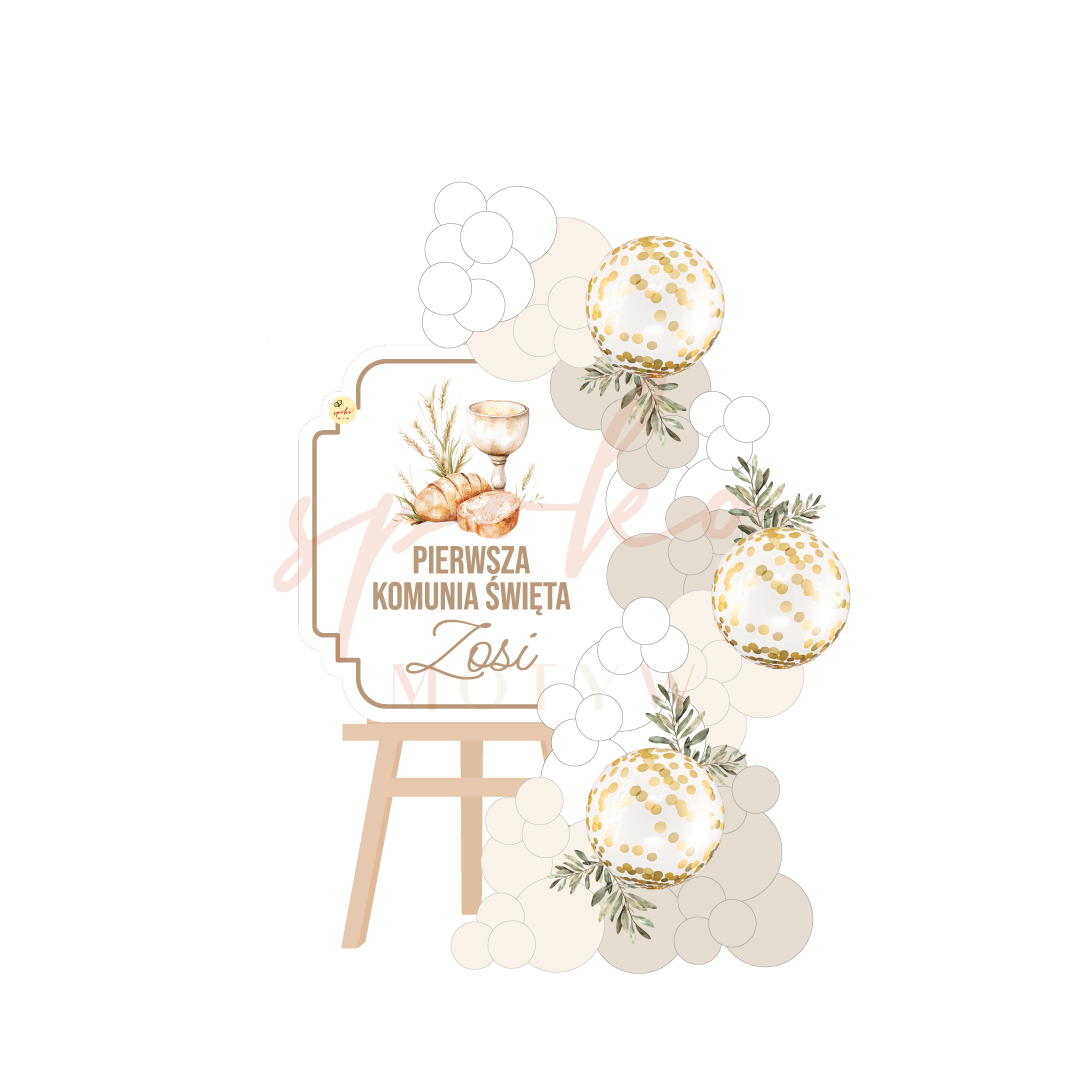 Szukasz szybkiej w rozstawieniu dekoracji na Pierwszą Komunię Świętą Twojego dziecka? Nasz personalizowany zestaw dekoracji to elegancka i efektowna forma dekoracji przyjęcia. Balonowa girlanda oparta o sztalugę z personalizowaną tabliczką tworzy piękne tło do zdjęć i przyciąga uwagę gości już od pierwszych chwil uroczystości.