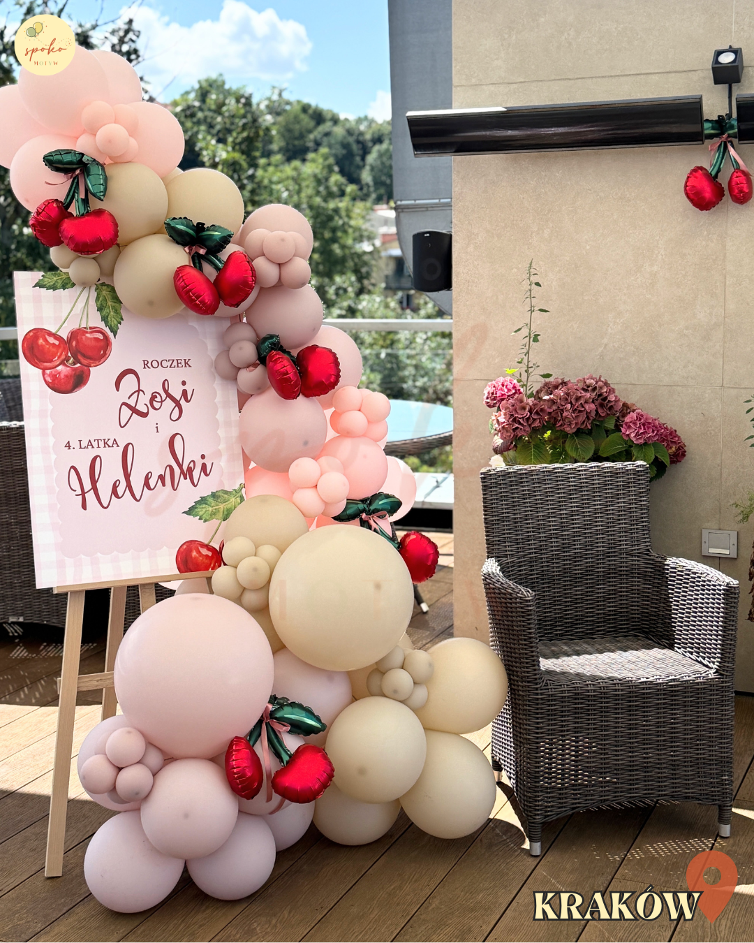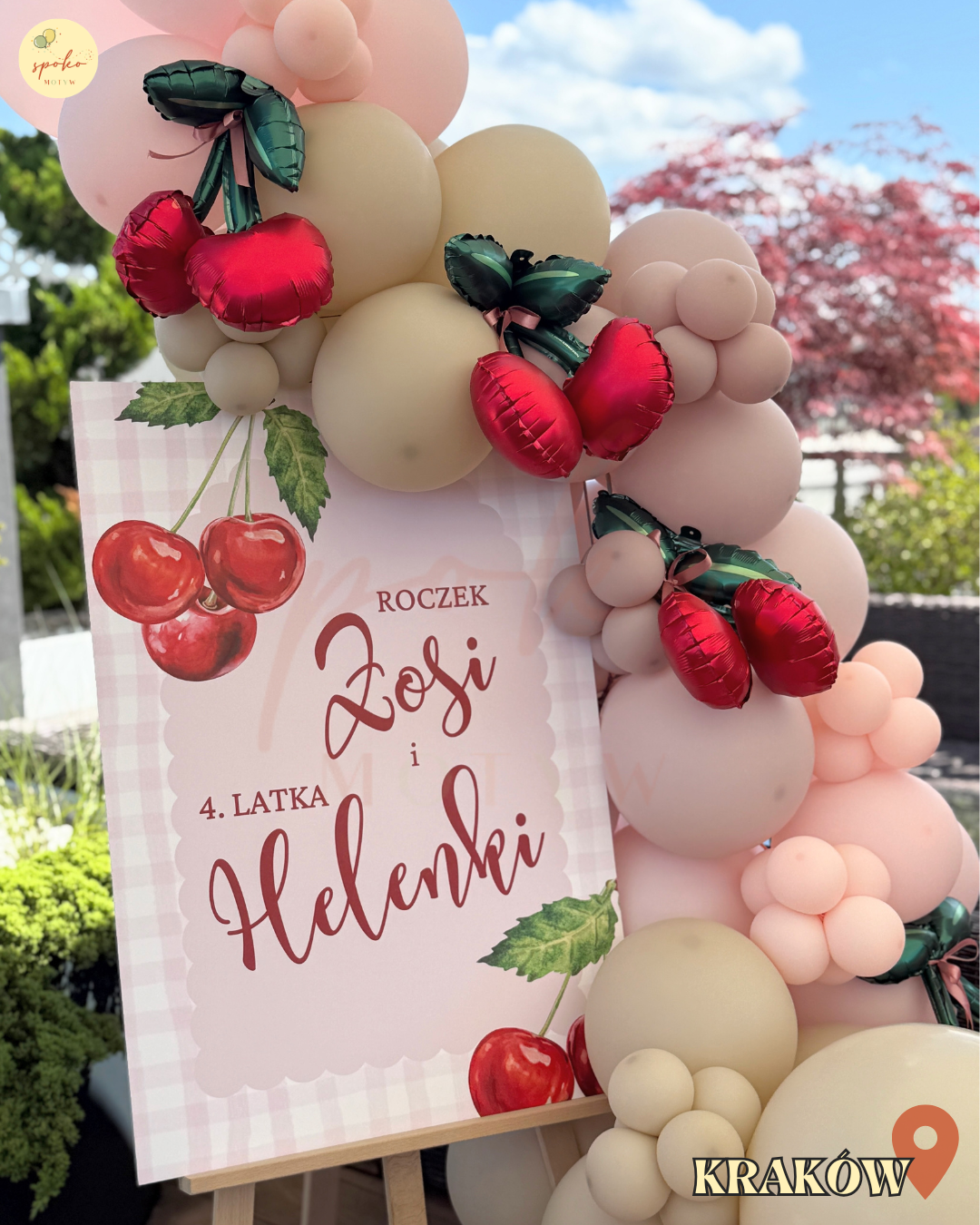 Szukasz szybkiej w rozstawieniu dekoracji na urodziny Twojego dziecka? Nasz tematyczny zestaw dekoracji z motywem WISIENEK to elegancka i efektowna forma dekoracji przyjęcia. Balonowa girlanda oparta o sztalugę z personalizowaną tabliczką tworzy piękne tło do zdjęć i przyciąga uwagę gości już od pierwszych chwil uroczystości.