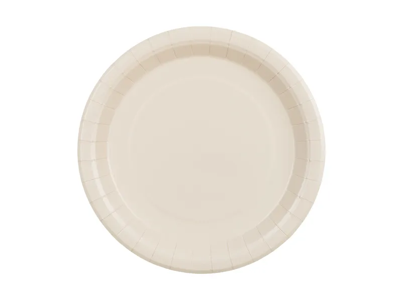 Talerzyki papierowe okrągłe w kolorze beżowym, średnica ok. 23 cm.