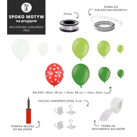 - 48 balonów, 30cm w czterech kolorach: czerwonym w białe kropki, białym, jasnozielonym, ciemnozielonym,