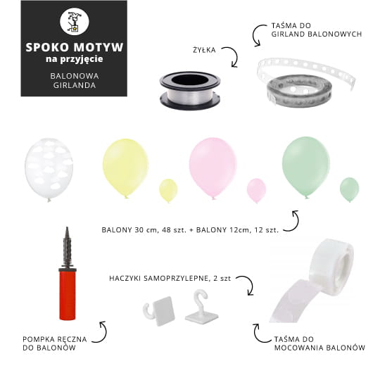- 18 balonów, 12cm w trzech kolorach: j. żółty, blady różowy, pistacjowy - do wizualnego wykończenia girlandy,