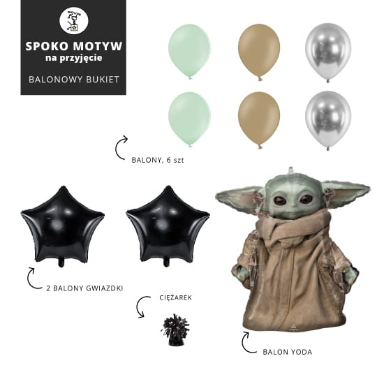 Bukiet z balonów to wyjątkowo wdzięczna dekoracja przyjęcia. Na czas imprezy ustawisz go w dowolnym miejscu. Będzie także pięknym dodatkiem do pamiątkowych zdjęć! Zestaw balonów z balonem w kształcie Mandaloriana Yody idealnie wpasuje się w przyjęcie z motywem Star Wars / Gwiezdnych Wojen.