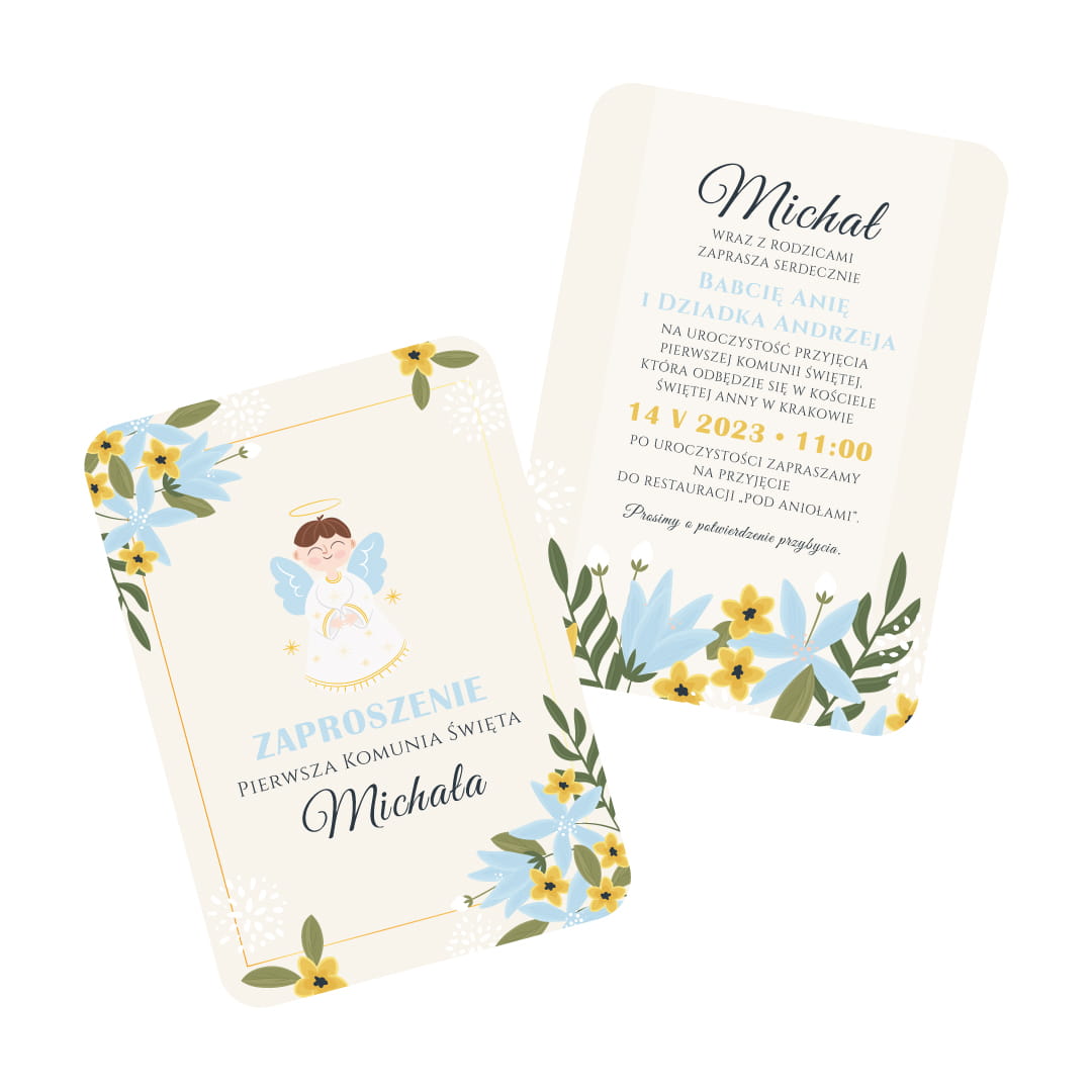 Komplet 4 personalizowanych zaproszeń na Pierwszą Komunię Świętą w nowoczesnym stylu. Czy wiesz, że zaproszenia z aniołkiem i wiosennymi, dzikimi kwiatami to część naszej kolejkcji dekoracji na Pierwszą Komunię świętą - NIEBIAŃSKA ŁĄKA? Zaproszenia dostępne są w dwóch wersjach - z aniołkiem - dziewczynką i aniołkiem - chłopcem.