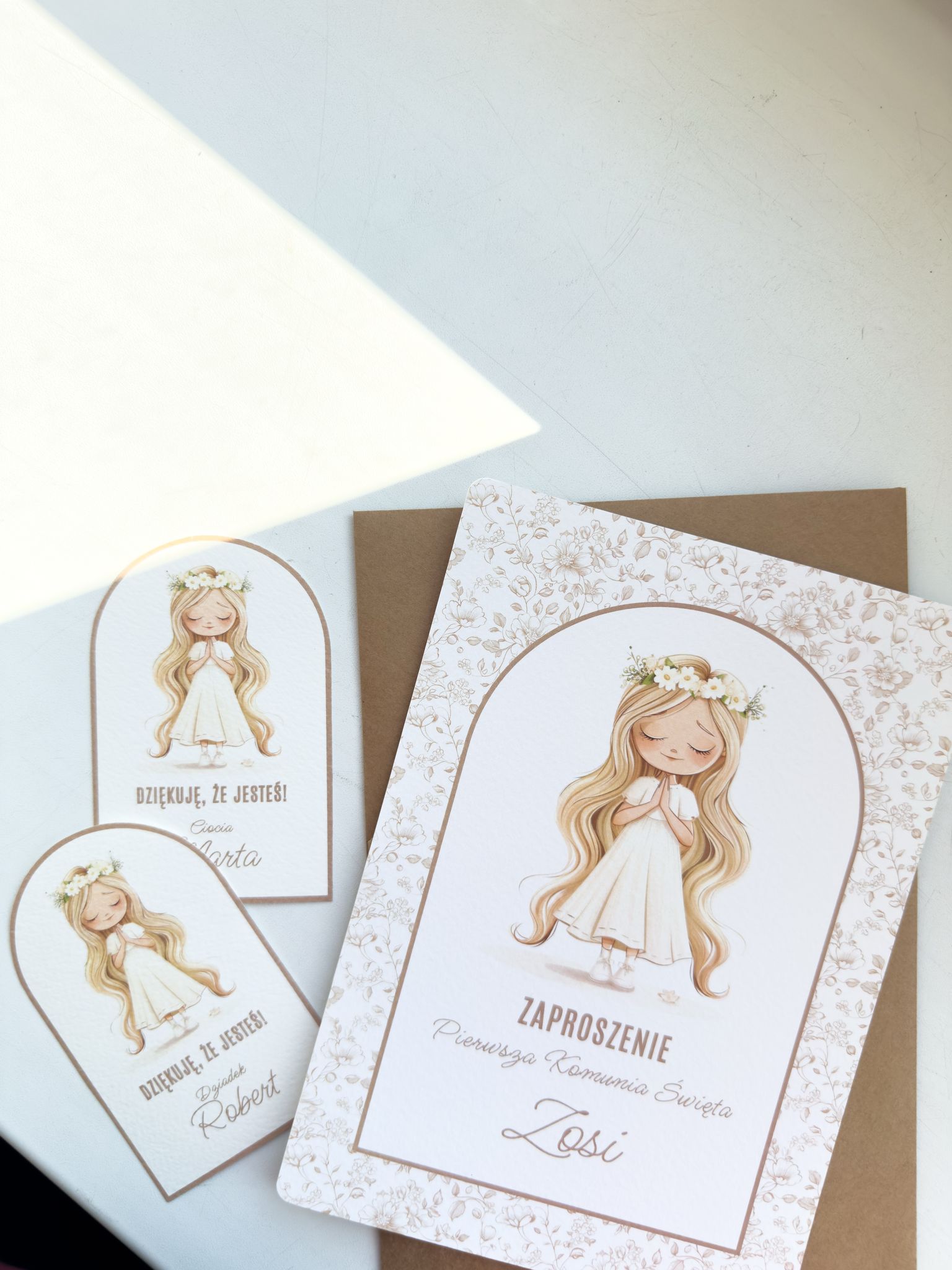 Komplet 4 personalizowanych zaproszeń na Pierwszą Komunię Świętą. Czy wiesz że zaproszenia są częścią naszej kolekcji BEŻOWA ELEGANCJA? Zaproszenia są dostępne w czterech wersjach - chłopiec i dziewczynka z blond oraz brązowymi włosami. Do zaproszeń dołączone koperty z brązowego papieru ECO lub klasyczne, białe (do wyboru).