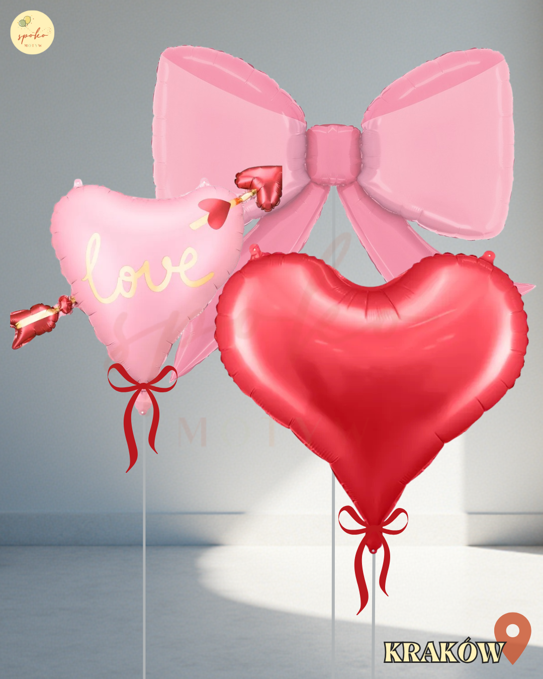 - 1 balon serce ze strzałą i napisem "love", w kolorze różówym
