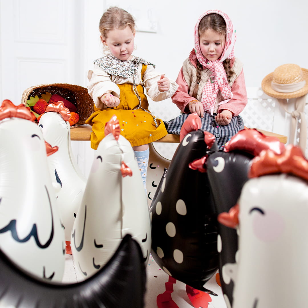 - balony foliowe kształty: stojący traktor, kurkę i kogucika, świnkę, krówkę i kurczaka
