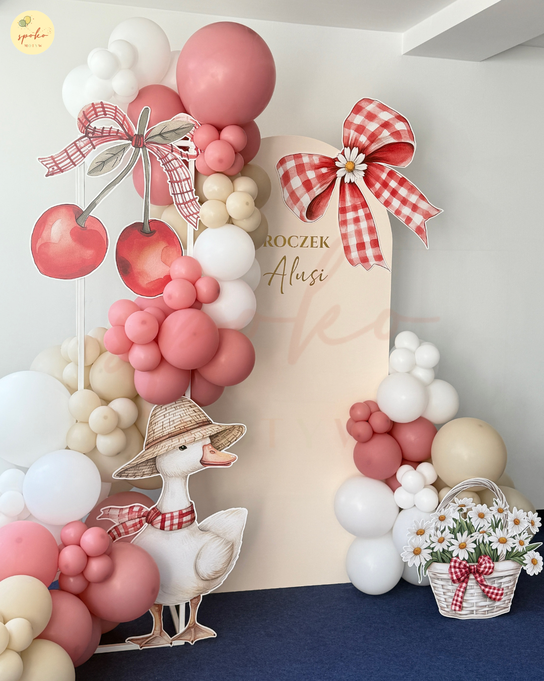 Zestaw dekoracji „Gąska” to gotowa scenografia na urodziny dziecka, która w kilka minut pozwala stworzyć piękną ściankę do zdjęć w stylu country. Kartonowa ścianka, gąska w kapeluszu, kokarda, koszyk ze stokrotkami i czeresienki tworzą spójną i radosną aranżację w sielskim klimacie.