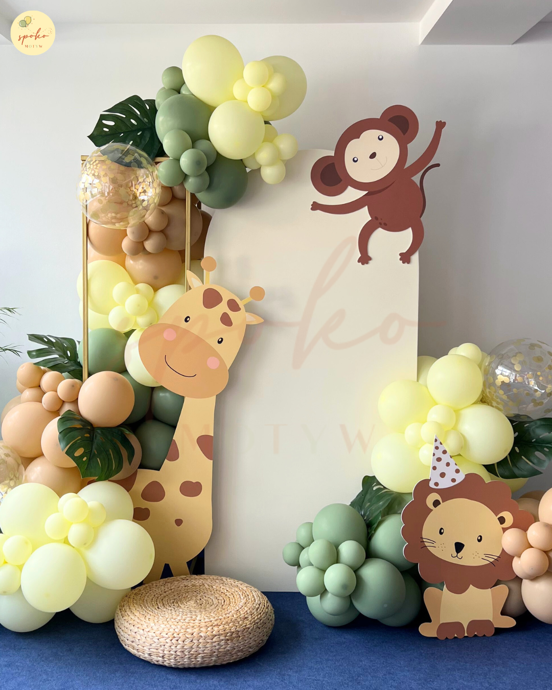 Motyw safari to jeden z najchętniej wybieranych tematów dziecięcych przyjęć - egzotyczne zwierzęta, naturalne kolory i balony tworzą atmosferę prawdziwej urodzinowej przygody w dżungli.